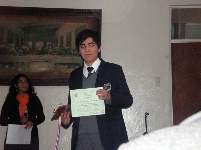 Marcelo Estay Herrera, alumno de 4° medio B, obtiene la mayor distinción, en la categoría ensayo, en concurso organizado por el colegio Asuntta Pallota. El jurado califico su trabajo como excelente, haciéndolo merecedor de la medalla «Divino Tesoro«.